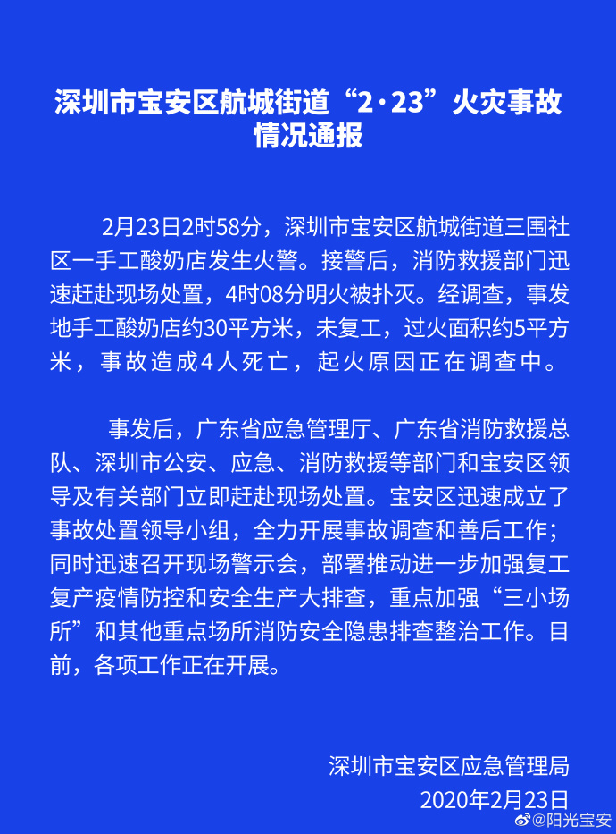 大火無情,在火災發生的時候,往往不會給人留下任何反應的余地,轉瞬之間就有可能釀成無法挽回的損失,甚至有人還會為此而丟掉性命,因此應對火災最好的措施就是預防,千萬不能有任何粗心大意。2月23日,深圳就發生了一起火災事故。2月23日下午,深圳寶安區官微@陽光寶安 發布情況通報,寶安區航城街道三圍社區一手工酸奶店當日凌晨2時58分發生火災,事故造成4人死亡,目前起火原因正在調查中。