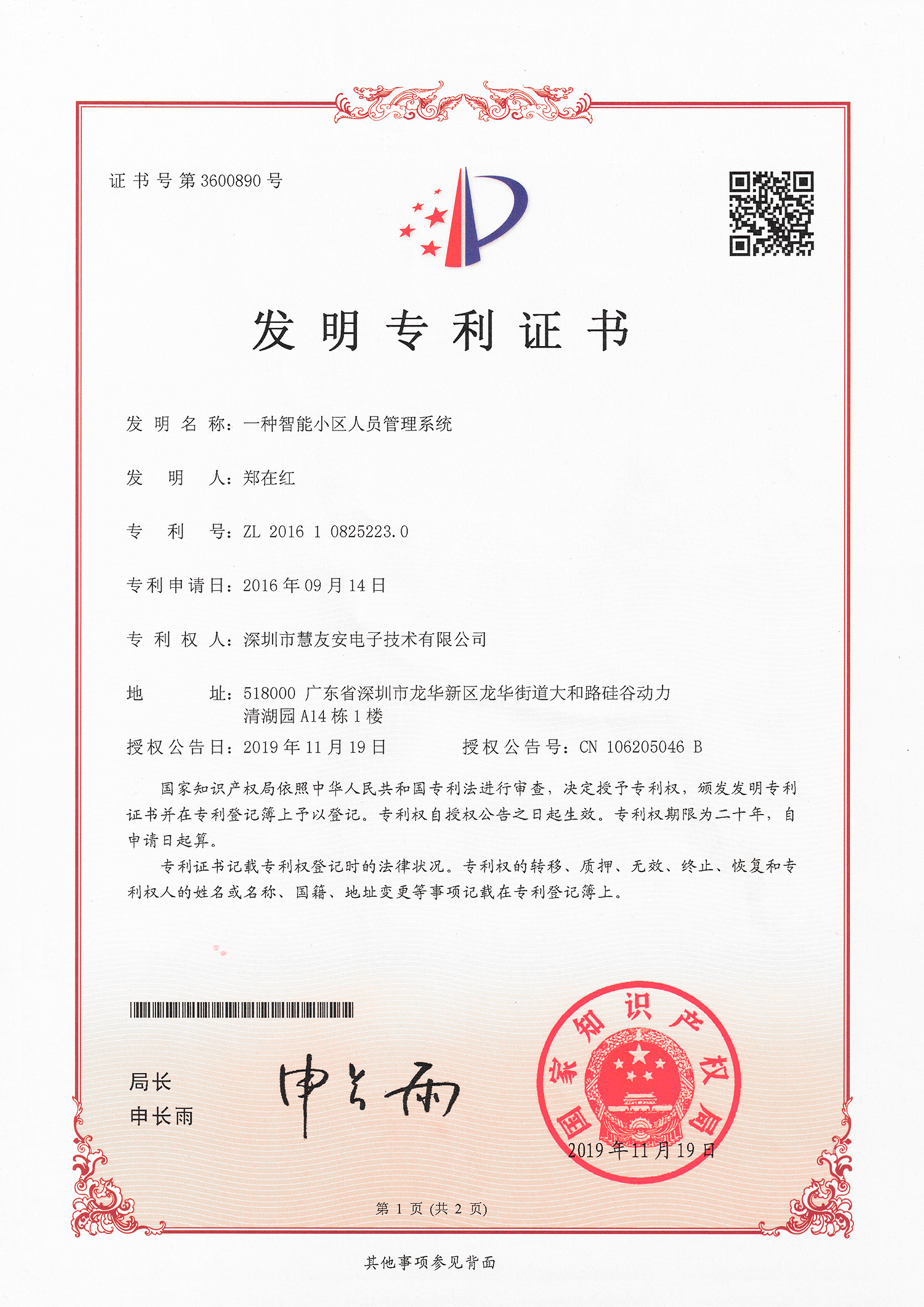 | 20 | 發(fā)明專利 | CN106205046B | 2019-11-19 | 一種智能小區(qū)人員管理系統(tǒng) | 已授權(quán) |