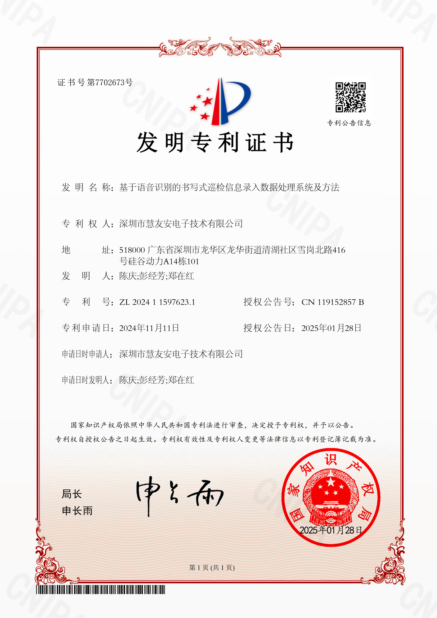 | 3 | 發(fā)明專利 | CN117133065A | 2023-11-28 | AI智能語音交互巡檢方法與裝置、存儲介質(zhì) | 審查中 |
